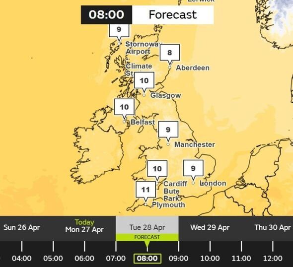 In Scotland, Aberdeen will see 8C, and Glasgow will be 10C. In Northern Ireland it will be 10C in Belfast.