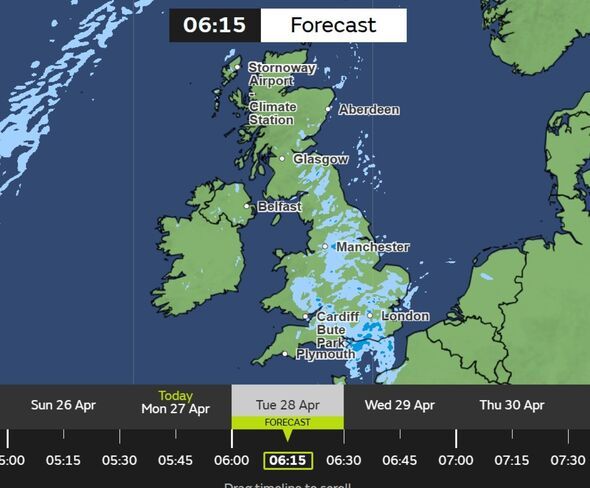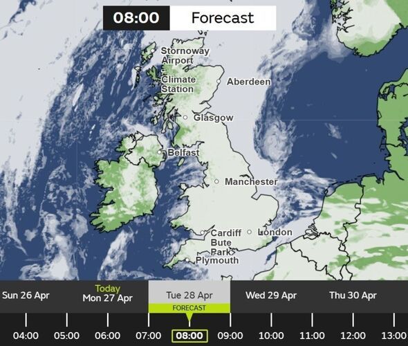 The Met Office maps show that on Tuesday, April 28, the weather will take a turn. At 8am, the maps show nearly the whole of the UK to be covered by clouds. The only places that look set to avoid the cloudy skies are the Scottish Highlands and parts of Northern Ireland.